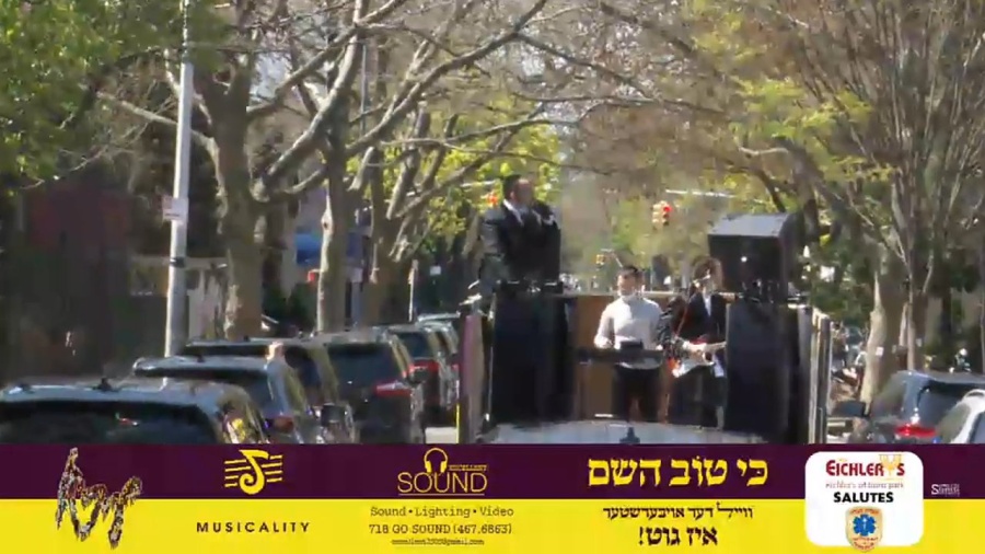 As preparations went on in kitchens of frum Jewish neighborhoods for the final days of Pesach, their children were occupied outside on Tuesday, as a music truck with Lipa Schmeltzer and Yossi Shtendig brought joy to all.