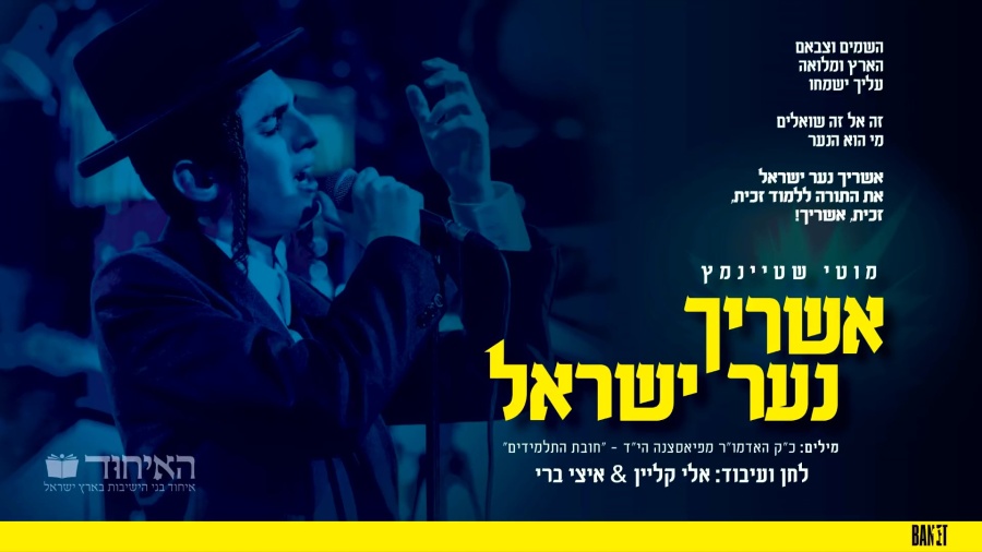על רקע ההתלכדות הארצית לחיזוק פעילות "איחוד בני הישיבות", מבצע אמן הרגש ר' מוטי שטיינמץ בהוקרה לעשרות אלפי בחורי הישיבות את השיר שמסומן כלהיט הבא של עולם התורה: "אשריך נער ישראל, את התורה ללמוד זכית, אשריך!".