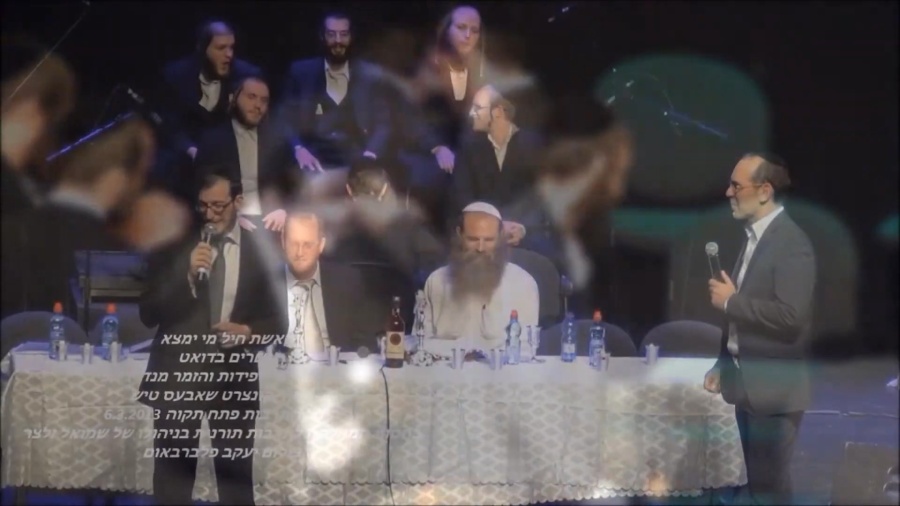 מנדי ג'רופי במופע ''שאבעס טיש'' היכל התרבות פתח תקווה (6/3/13). מנדי ביצע את הניגון החבדי ''הוא אלוקינו'' ואף ביצע ''פיה פתחה'' בדואט עם ישי לפידות.